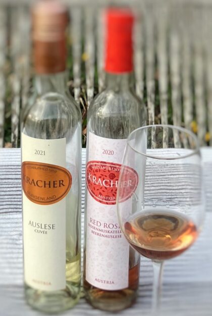 Wir haben von Kracher eine 2021 Auslese Cuvée von 60% Chardonnay und 40% Welschriesling verkostet. Für diesen Wein wurden nur die von Botrytis befallenen Trauben gelesen, – in acht aufeinanderfolgenden Lesedurchgängen.
